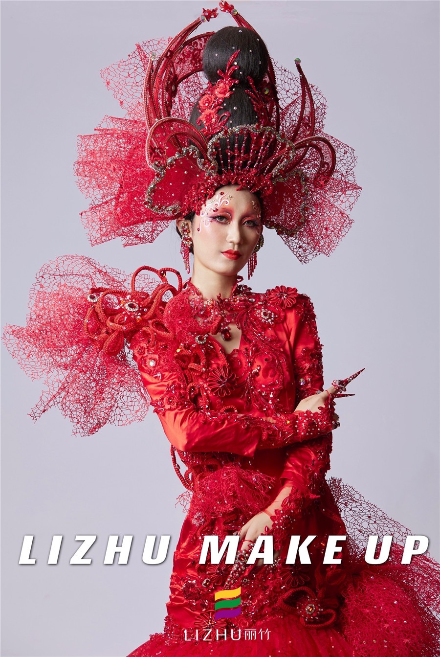 南寧彩妝造型培訓(xùn)學(xué)校創(chuàng)意彩妝作品---戰(zhàn)姬:這款整體造型以“中國紅”為主色,修身的魚尾裙擺設(shè)計(jì)配以水鉆、刺繡和精致的頭飾,妝面以紅色為主,運(yùn)用簡單線條描繪以及大面積暈染的手法處理,妝面與服裝、頭飾相呼應(yīng),視覺沖擊十足。