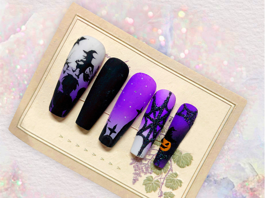 美甲繪制靈感來(lái)源:神秘深邃的夜色里,黑色剪影下的女巫騎著掃把,在烏鴉的陪伴下,從男孩眼前飛過(guò)。在靜謐的得白色月光照耀下,閃現(xiàn)出一幅既充滿童趣,又略帶詭異氛圍的剪影畫面。