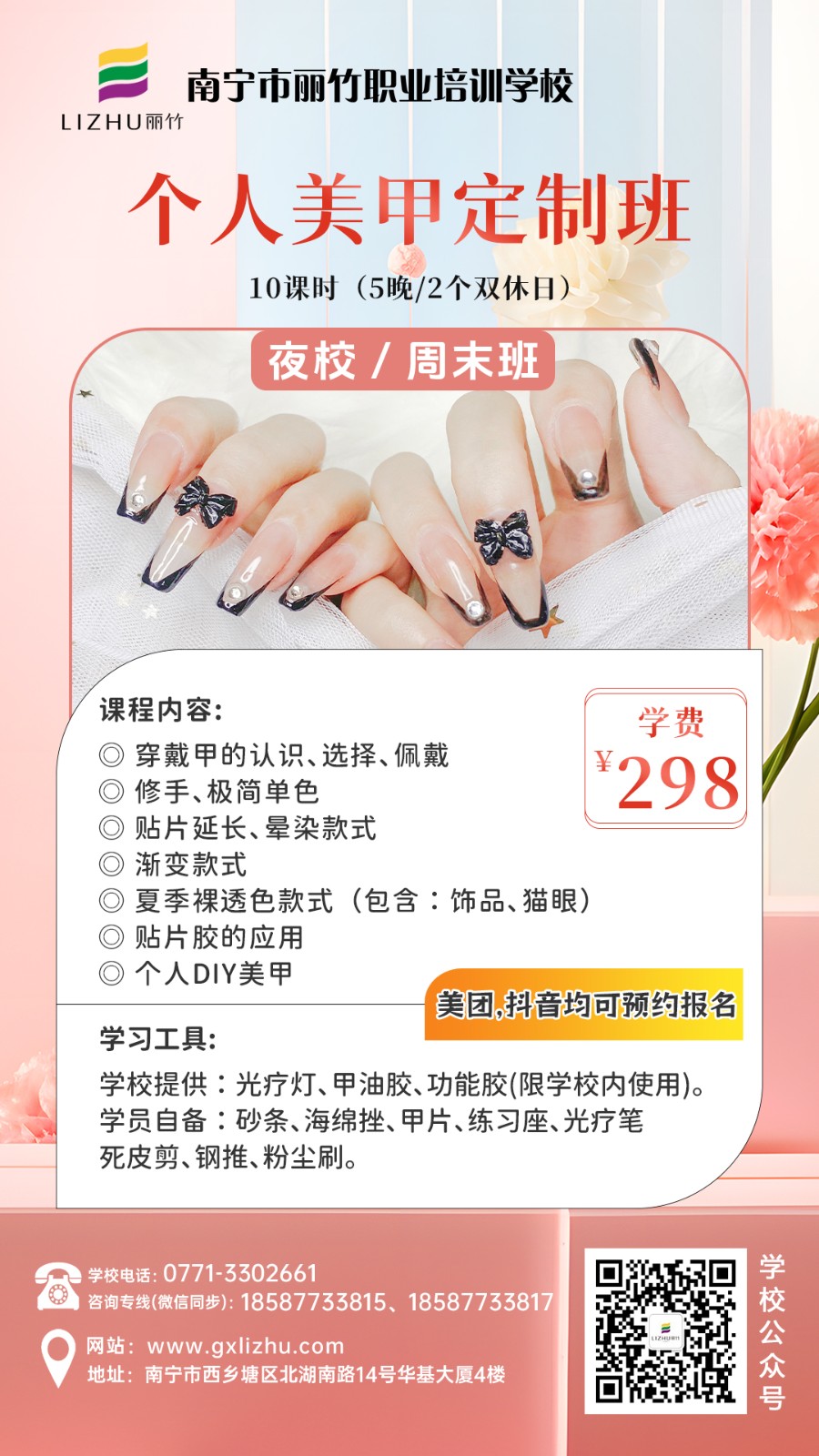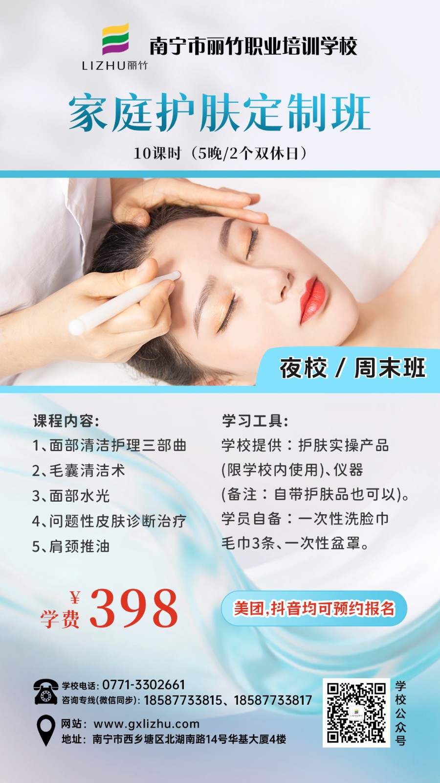 廣西彩妝造型學(xué)校、廣西美甲培訓(xùn)、廣西美容短期班、廣西培訓(xùn)紋唇、廣西紋繡眉眼唇學(xué)習(xí)分享:麗竹學(xué)校特色課程(夜校/周末班)熱門火爆技能課程重磅來襲啦!課程涵蓋化妝,美甲,美容,紋繡等技能,感興趣的小伙伴趕緊關(guān)注麗竹學(xué)校了解更多課程詳情和現(xiàn)在正在進(jìn)行的優(yōu)惠活動詳情。