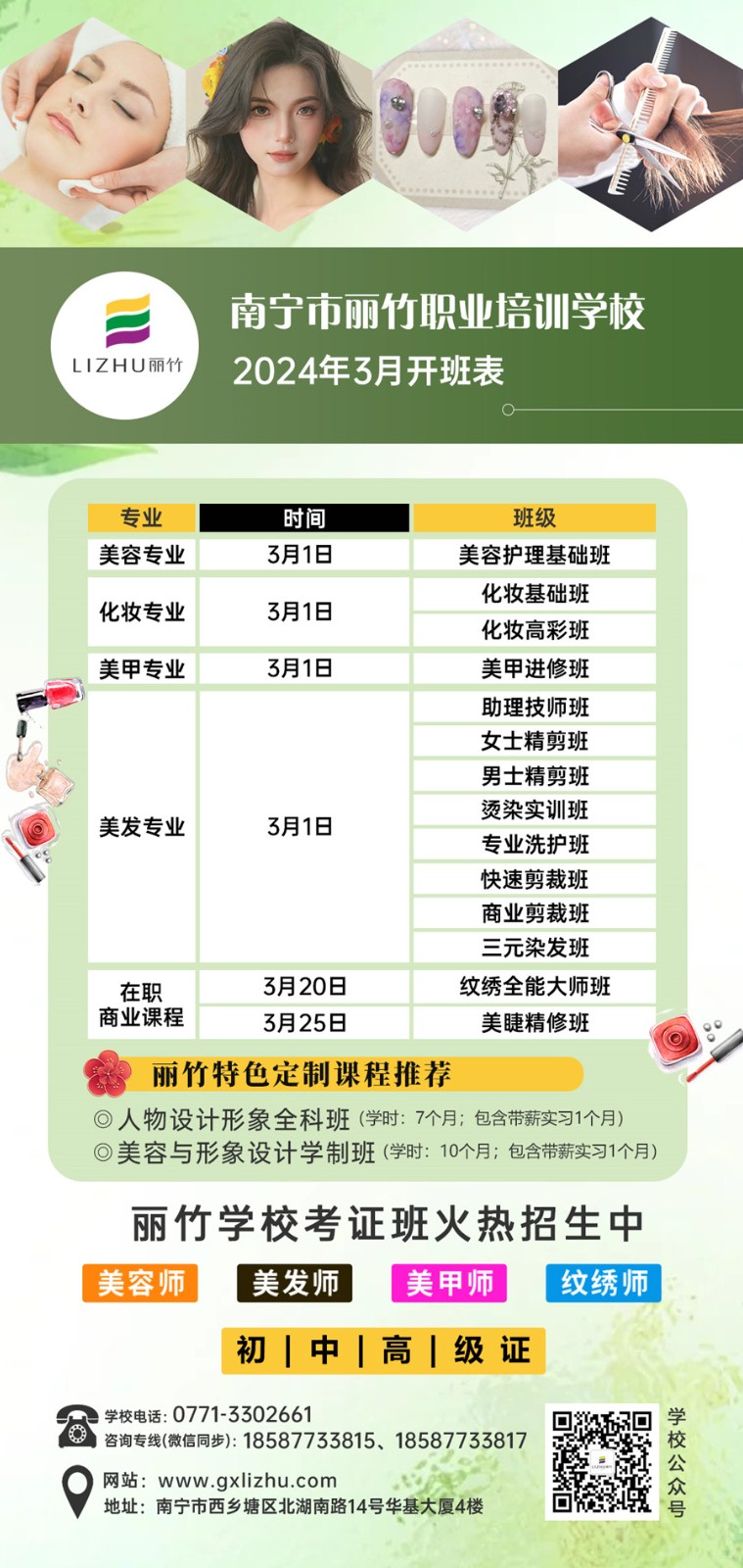 如果你想學習美業(yè)技術,想在廣西零基礎學美容美發(fā)?想知道廣西化妝美甲培訓在哪里?廣西哪里學紋繡專業(yè)?同時還想到廣西美睫學校去學美睫?那么,請你千萬不要錯過廣西美業(yè)專業(yè)職業(yè)學校-麗竹學校3月的開班安排了啦!早學早就業(yè),就能早點實現(xiàn)人生目標。